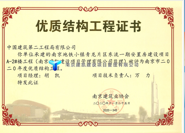2021年荣获优质结构项目—南京地铁小镇青龙片区东流一期安置房建设项目