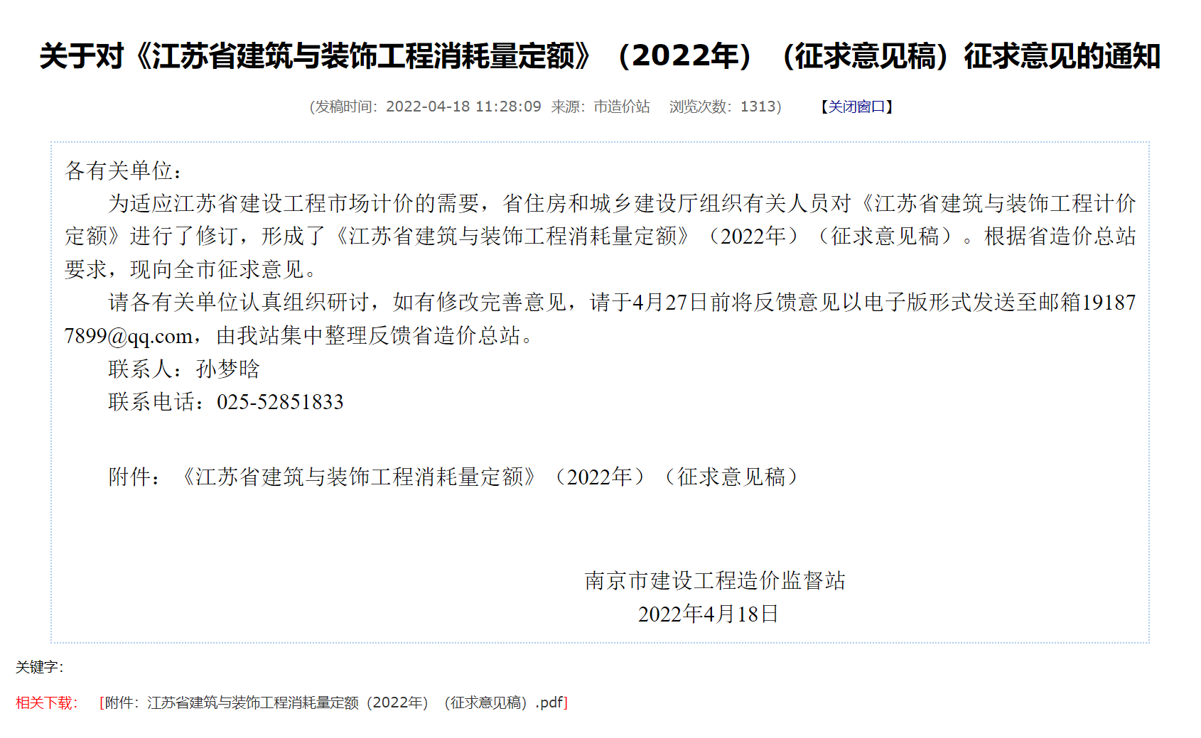 转发关于对《江苏省建筑与装饰工程消耗量定额》(2022年) (征求意见稿) 征求意见的通知,其下载连接如下所示: