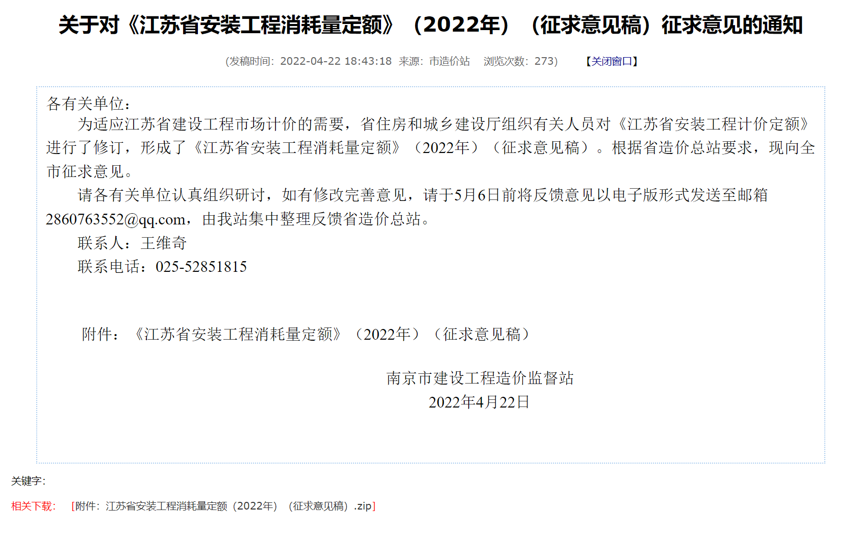 转发关于对《江苏省安装工程消耗量定额》(2022年) (征求意见稿) 征求意见的通知,其下载链接如下所示: