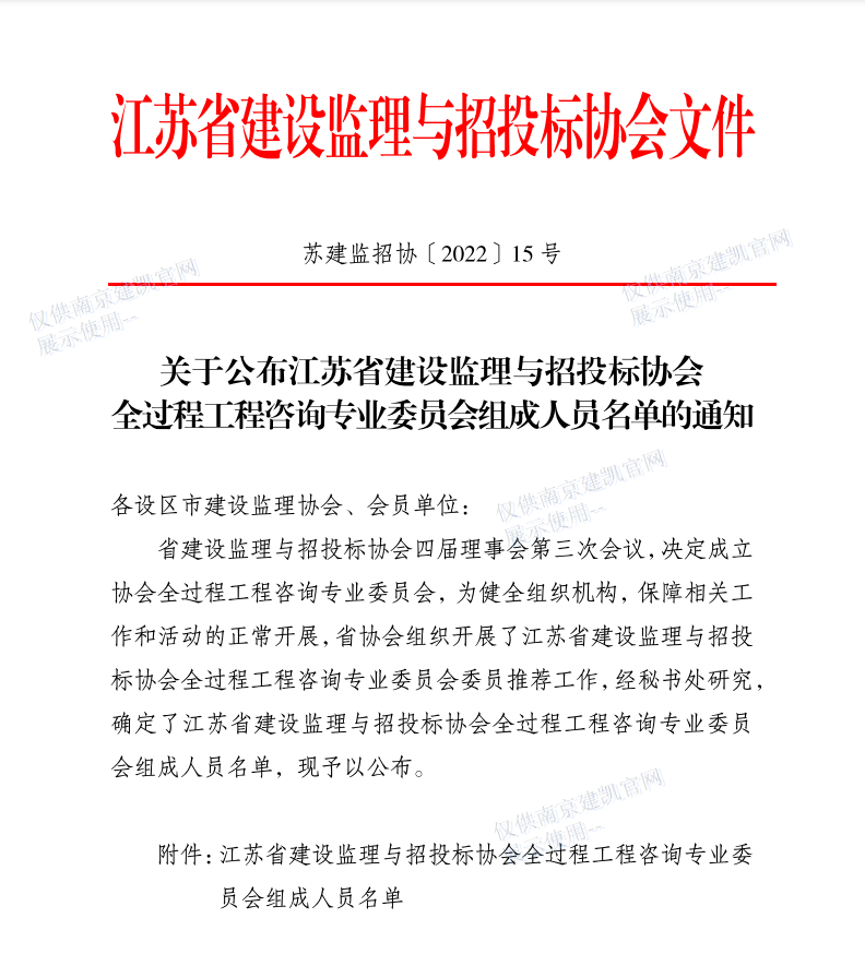 恭喜我司李庆传同志入选“江苏省建设监理与招投标协会全过程工作咨询专业委员会组成人员名单”