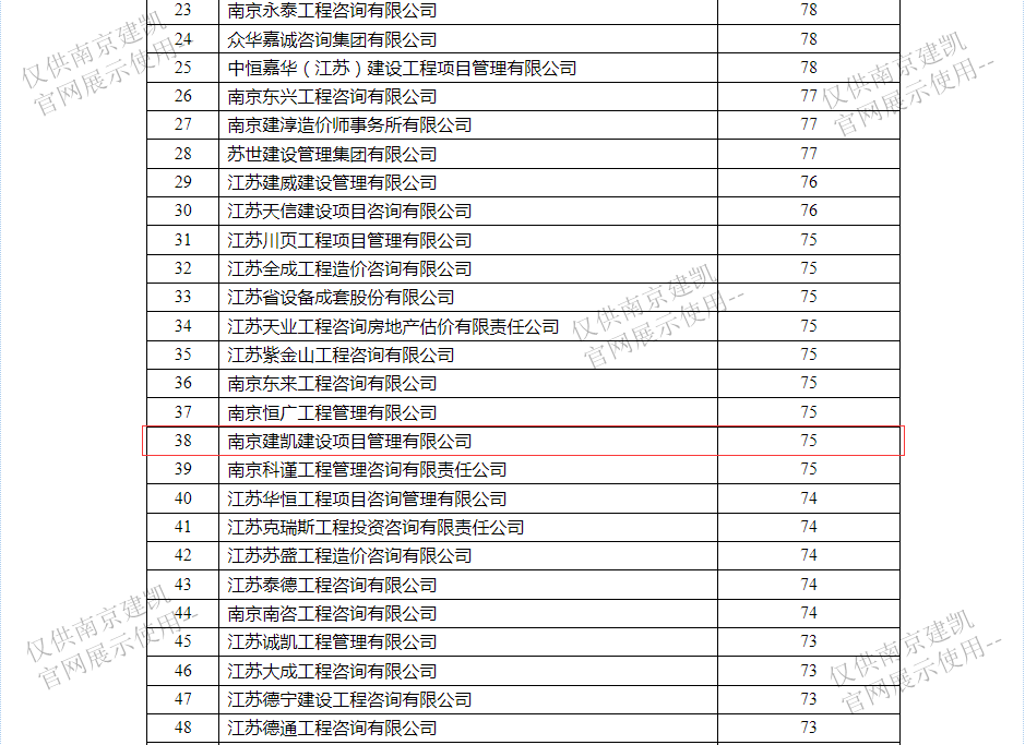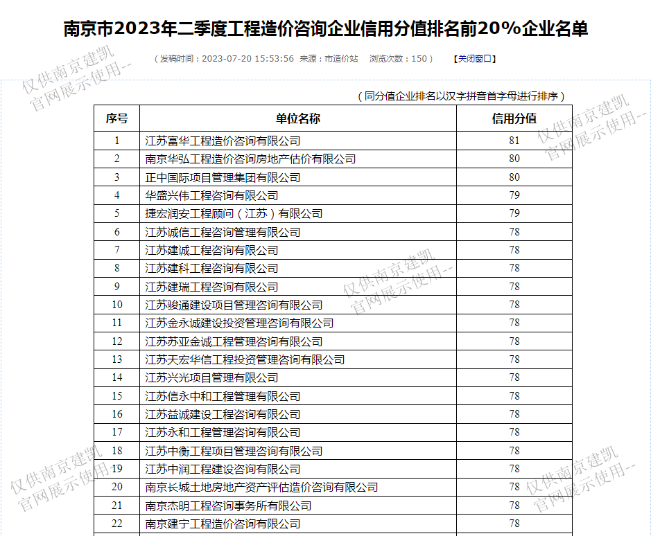 恭喜我司入选“南京市2023年二季度工程造价咨询企业信用分值排名前20%企业名单”