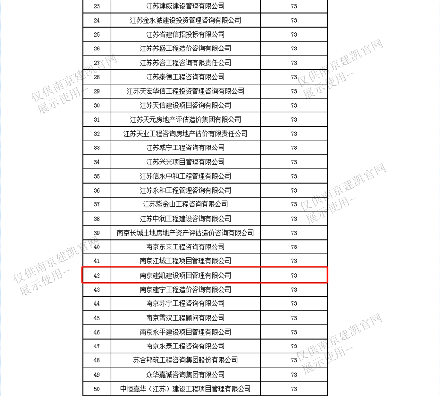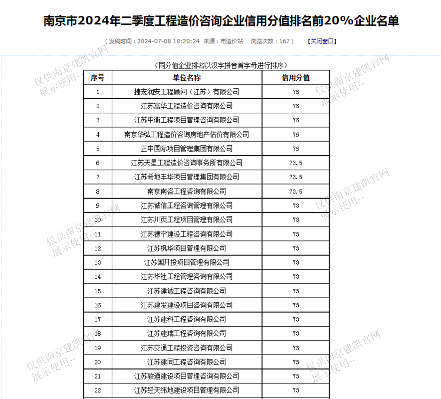 恭喜我司入选“南京市2024年二季度工程造价咨询企业信用分值排名前20%企业名单”