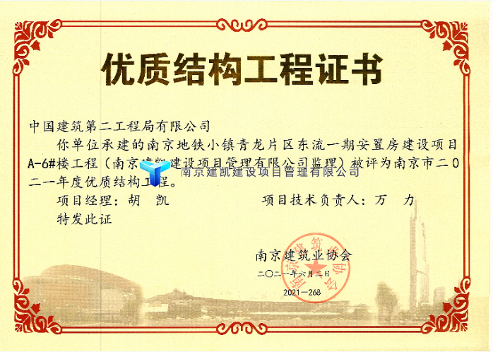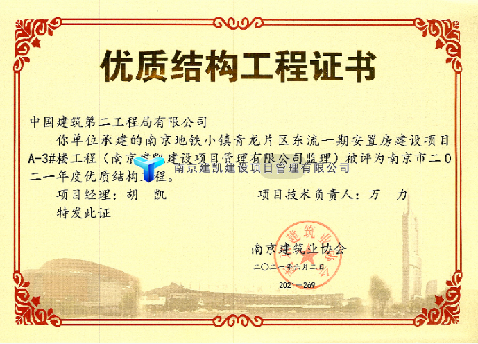 2021年荣获优质结构项目—南京地铁小镇青龙片区东流一期安置房建设项目(A3#楼、A6#楼)