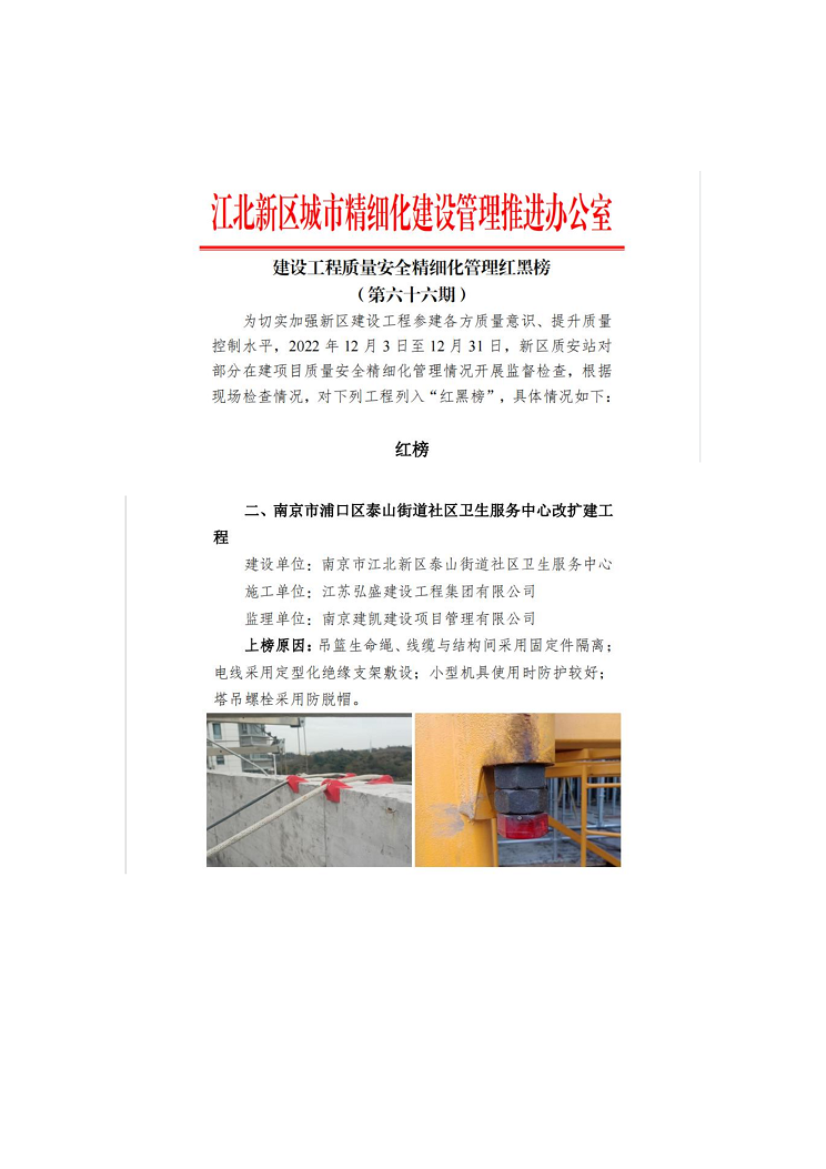 (2023年1月11日)南京市浦口区泰山街道社区卫生服务中心改扩建工程荣获《建设工程质量安全精细化管理红榜》
