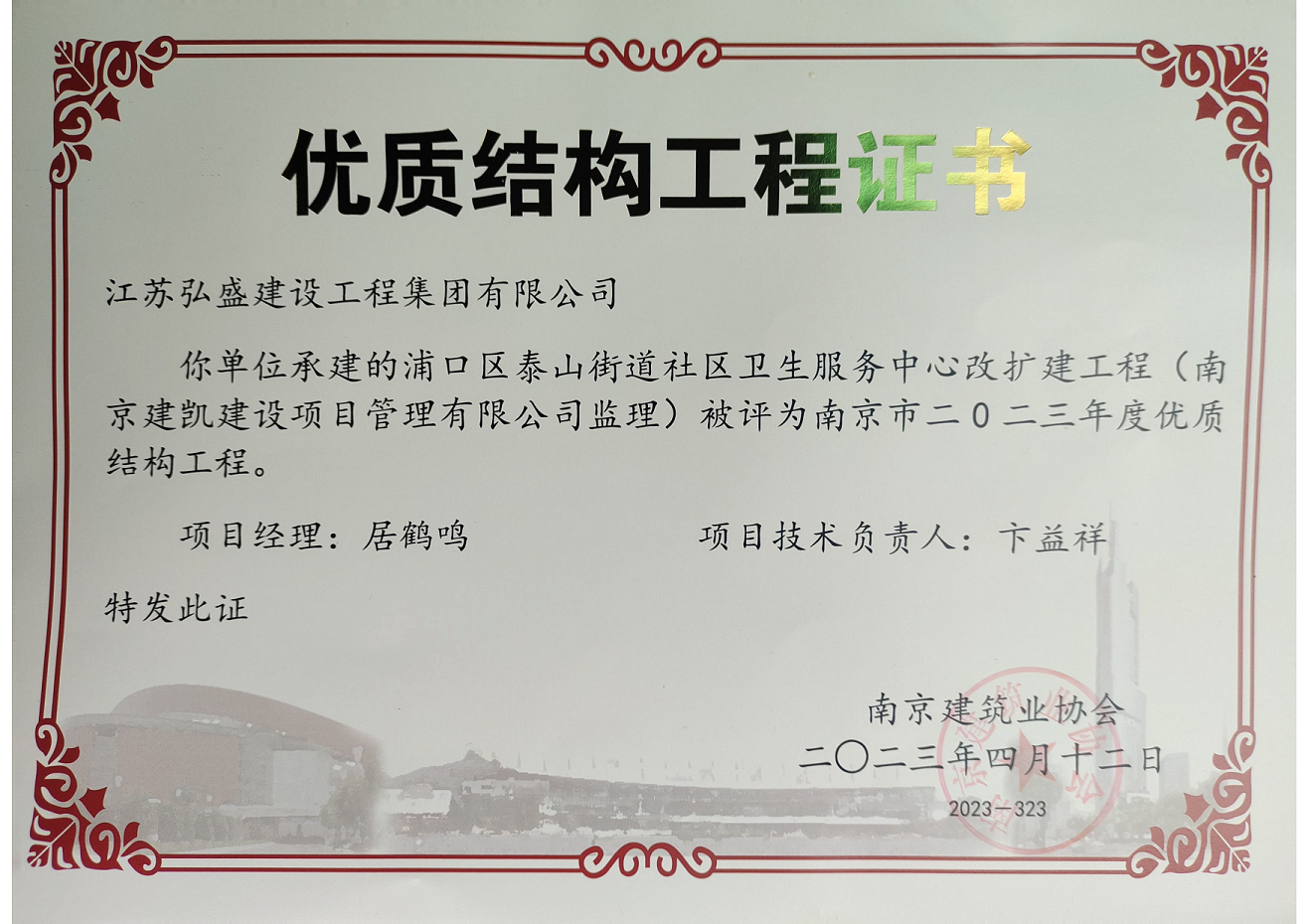 浦口区泰山街道社区卫生服务中心改扩建工程荣获“2023年度优质结构工程”