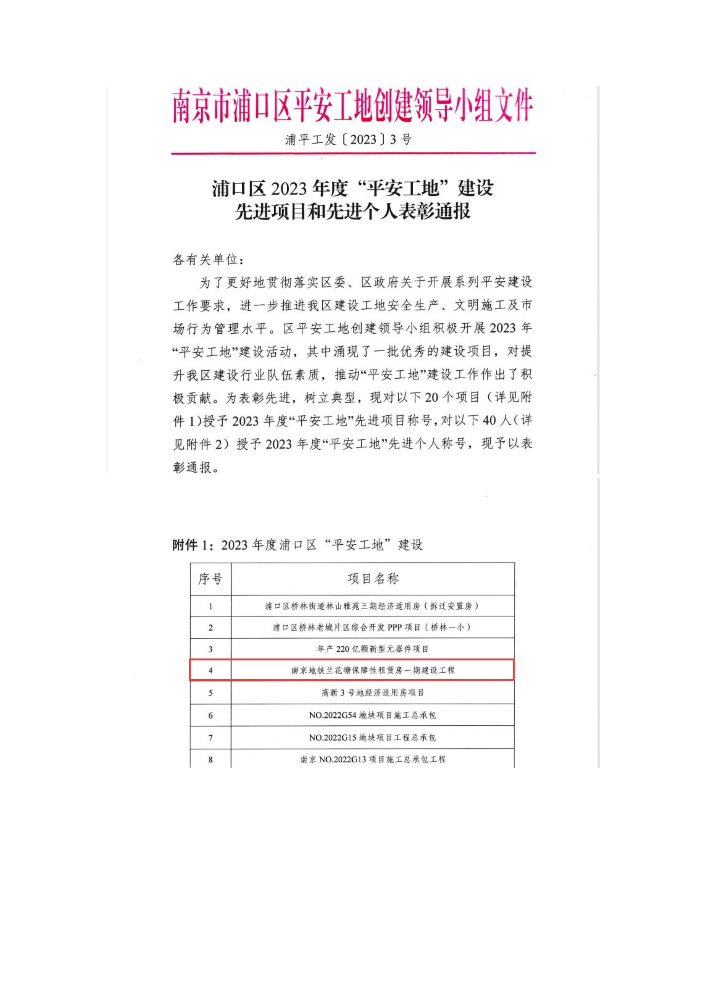 南京地铁兰花塘保障性租货房一期建设工程荣获“浦口区2023年度“平安工地”建设先进项目”