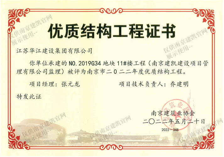 南京市二0二二年度优质结构工程(NO.2019G34地块11#楼工程)