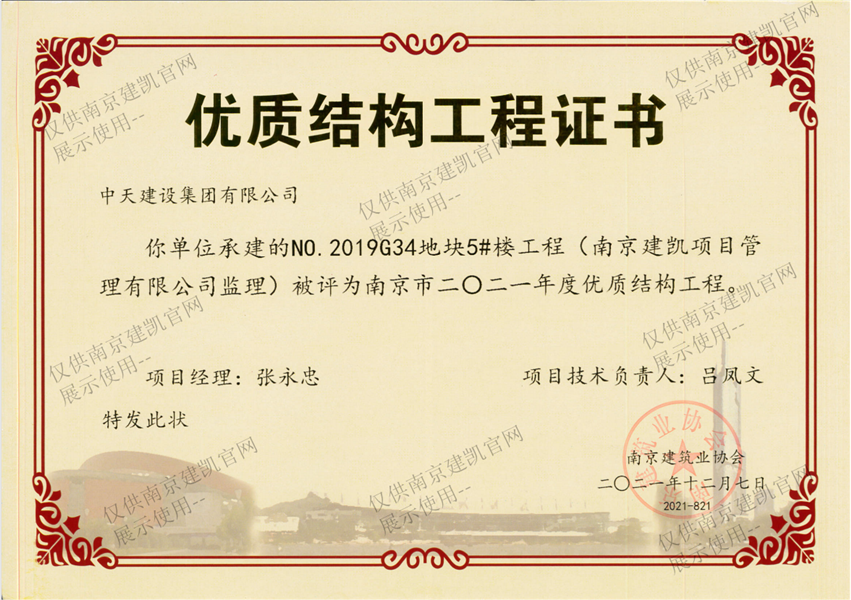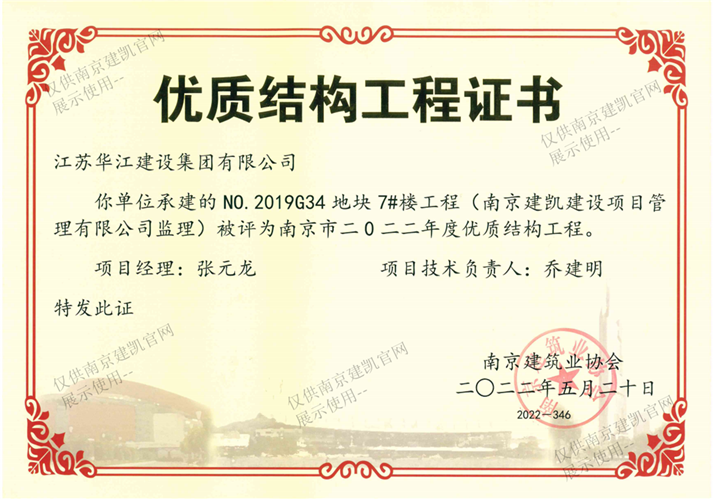 南京市二0二二年度优质结构工程(NO.2019G34地块7#楼工程)